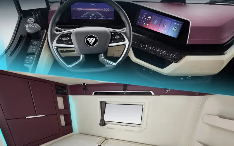 کابین فوتون گلکسی 9 چیزی فراتر از انتظار است. ابعاد بزرگ 2125×2450×1538 میلیمتری، فضای وسیعی را برای راننده فراهم میکند. تختخواب 1240 میلیمتری آن بزرگترین تخت خواب در صنعت است؛ ایدهآل برای رانندگیهای بینشهری و استراحتهای طولانی. دو نمایشگر 12.3 اینچی، کنترل کامل و تجربه بصری سطح بالا را ممکن میکنند. طراحی ضد گرد و غبار کابین نیز تجربهای راحت در شرایط آبوهوایی دشوار مانند بیابانها را تضمین میکند.